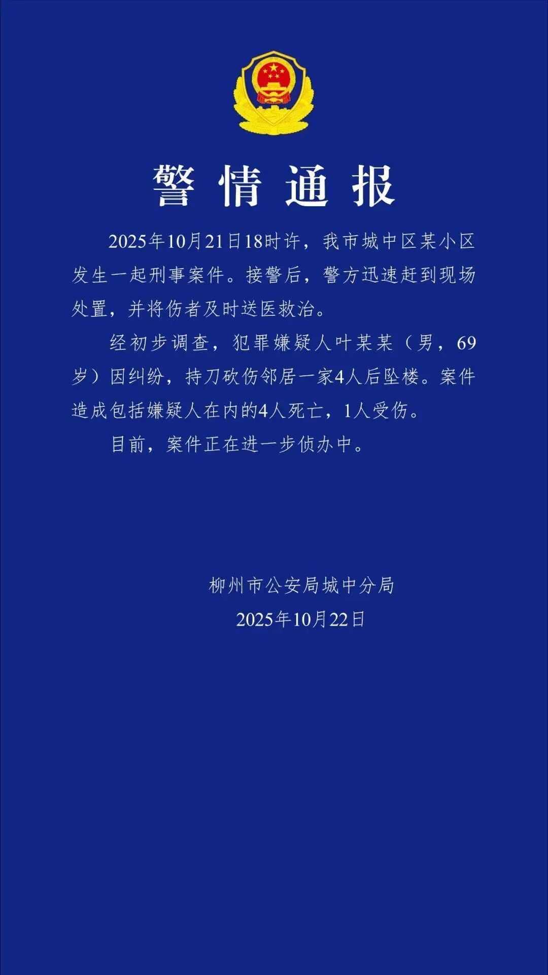 广西柳州市公安局城中分局10月22日通报,10月21日18时许,柳州市城中区某小区发生一起刑事案件。接警后,警方迅速赶到现场处置,并将伤者及时送医救治。经初步调查,犯罪嫌疑人叶某某(男,69岁)因纠纷,持刀砍伤邻居一家4人后坠楼。案件造成包括嫌疑人在内的4人死亡,1人受伤。目前,案件正在进一步侦办中。